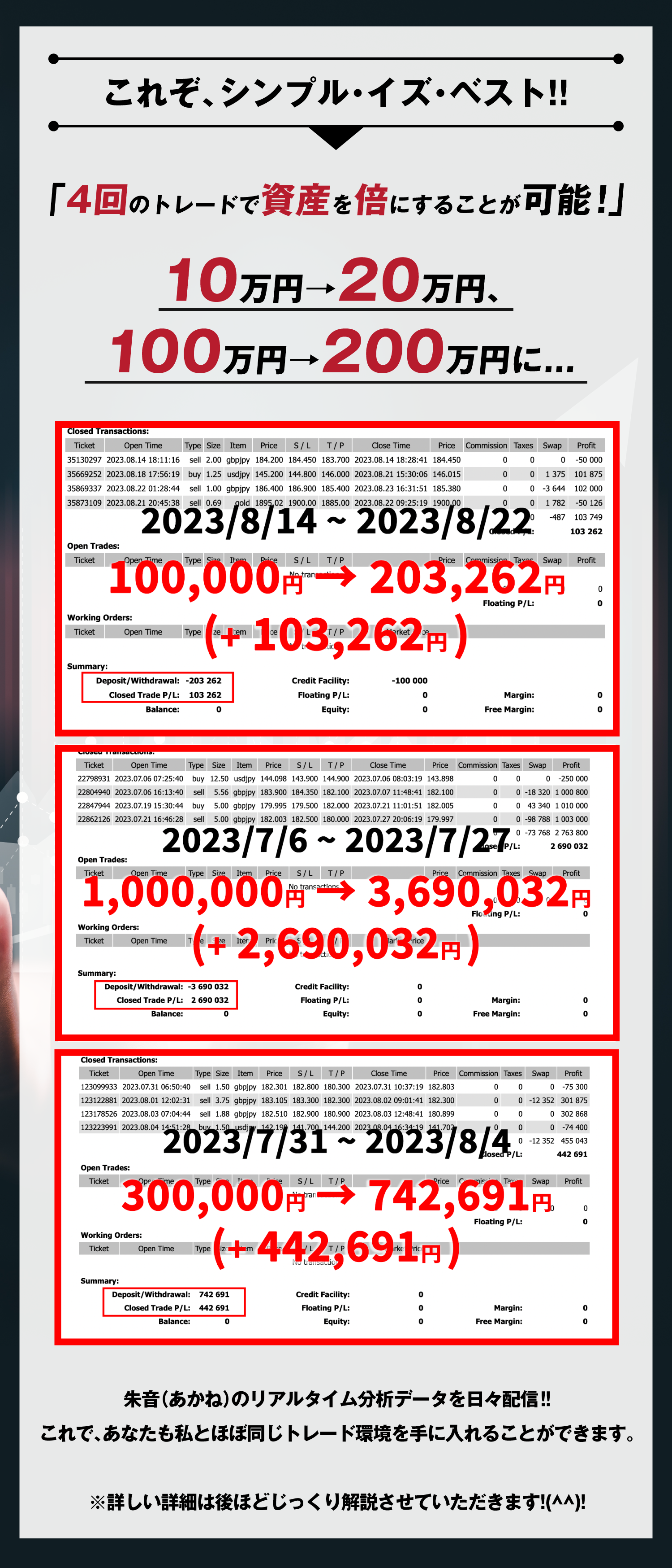 資産が倍々に膨らんでいくのを体感しながら、だんだんとトレードの勝ち方を理解していくはずです。