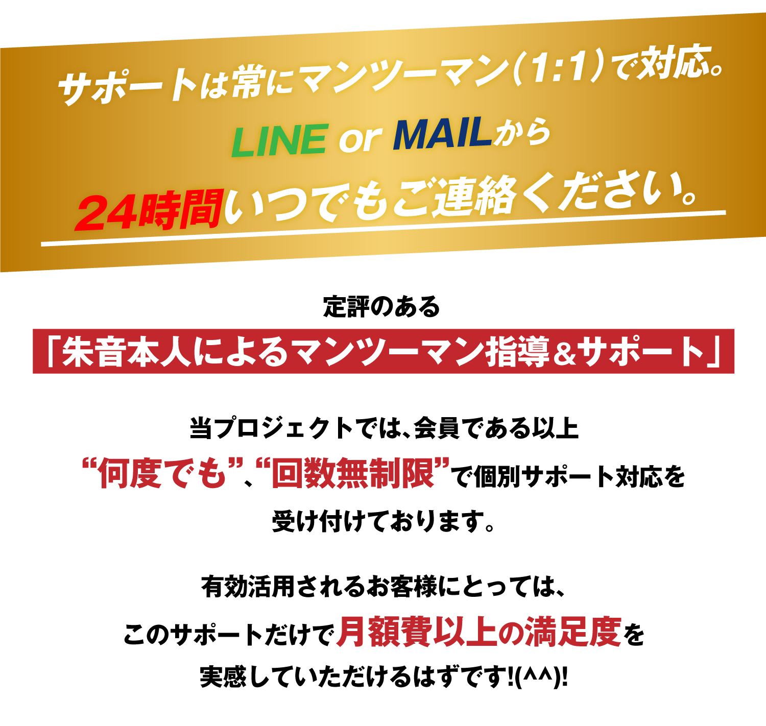 マンツーマンサポートが、1つの売りでもありますのでレスポンスのスピード感やサポートの質の低下の可能性を感じた時点で即終了としますのでその点は予めご了承ください。